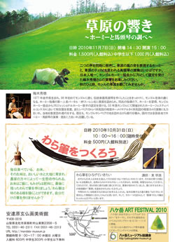 - 不思議な声に圧倒されました。目をつぶっていると、まるでモンゴルの草原に居る様です。また、機会がありましたら、参加してみたいと思いました。ありがとうございました。益々のご活躍をお祈り致します。