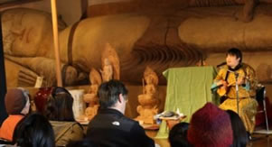 13m大涅槃像の前で演奏していただきました。高低二つの声を同時に発声させるホーミーという歌唱法。実は4種類もの出し方があるそうです。