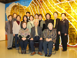 笑顔の出展者一同と涅槃仏2009年3月31日(火)から4月5日(日)まで、名古屋市民ギャラリー栄(名古屋市中区栄)で、出展者20名、仏画作品50点の展覧会を開催しました。初日は、安達原玄も出席しました。
