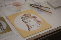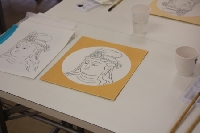 今回は本格的仏画に入る初歩の初歩からスタート。 色紙にチャコペーパー、ボールペン、とれーしんぐペーパーを用いて下書きをしました。 次に筆と墨で下書きをなぞっていきます。